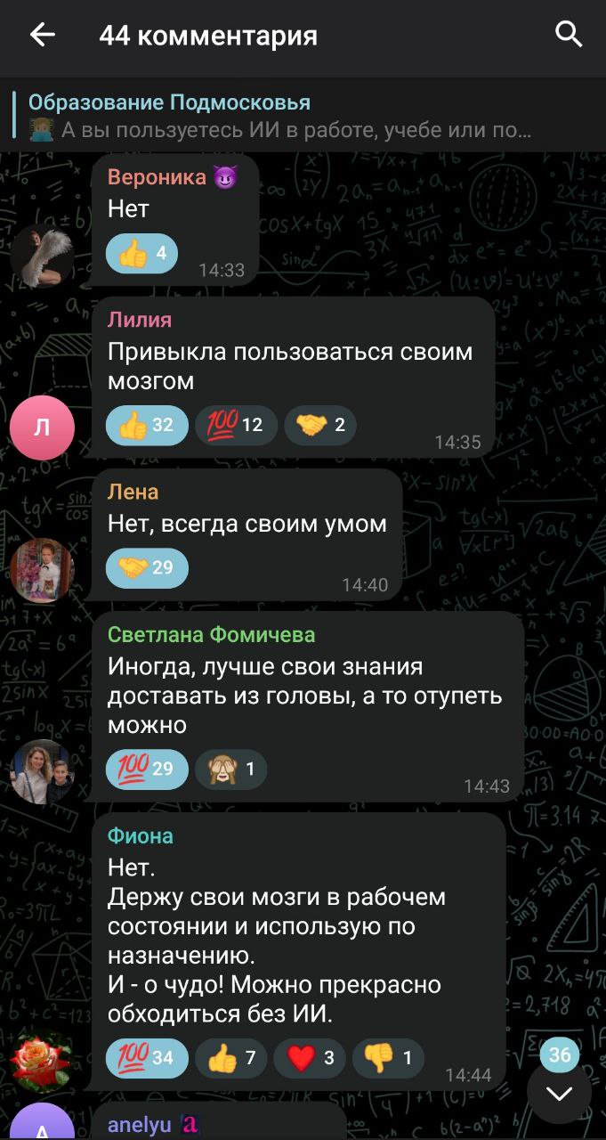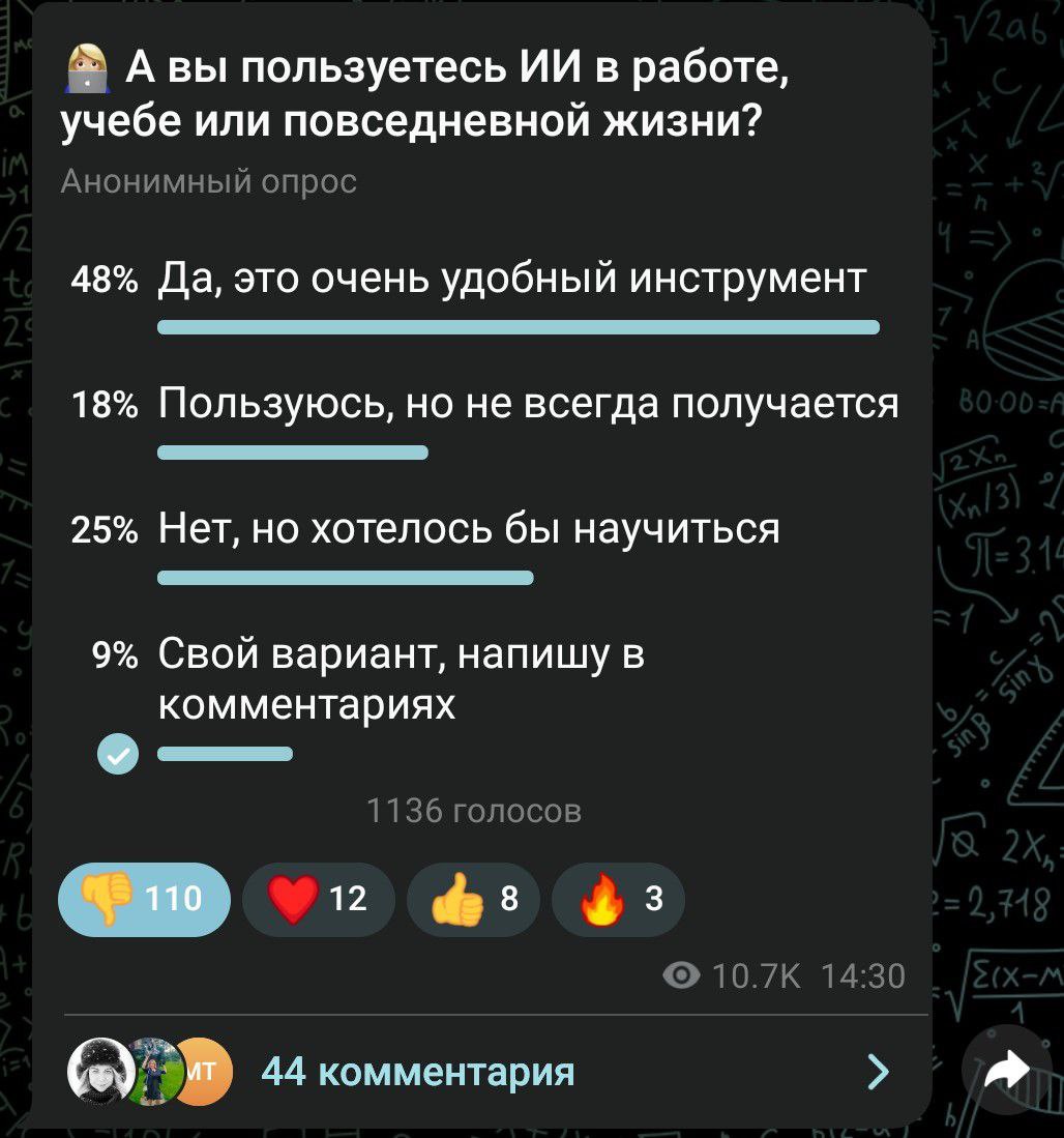 Канал «Образование Подмосковья» (официальный канал министерства образования Московской области) опросил своих читателей об отношении к ИИ, не дав вариантов для тех, кто не приемлет использование нейросетей. Однако подписчиков это не сильно затруднило и они достаточно красноречиво выразили негативное отношение к инструменту и опросу ответами и лайками.